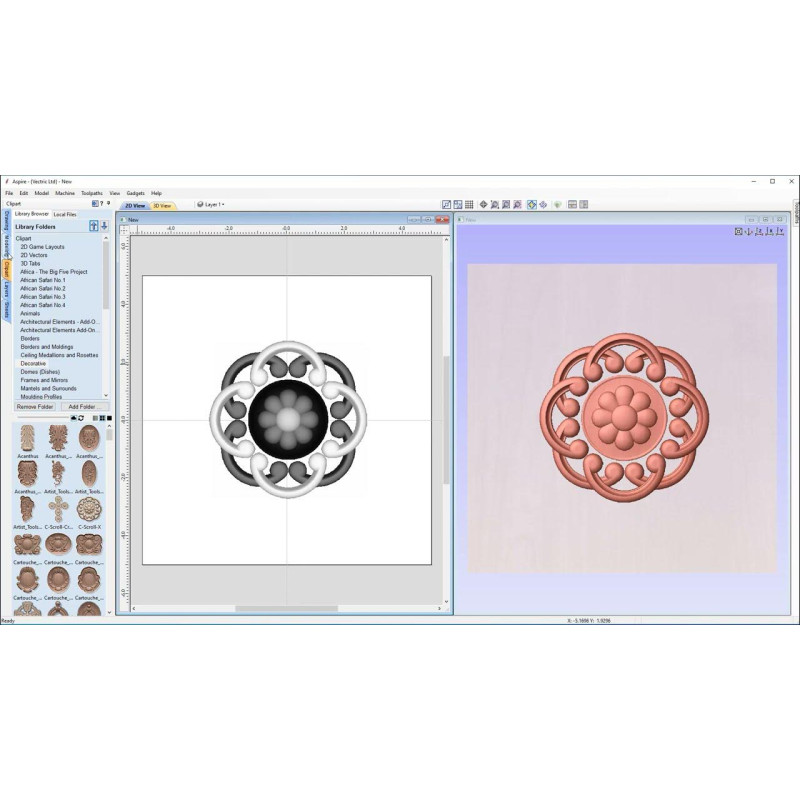 - У комплекті з Vectric Aspire постачається вбудована бібліотека готових 3D-елементів, зокрема рельєфів, декоративних рамок, орнаментів. Це особливо корисно для тих, хто хоче швидко додати складні елементи без ручного моделювання з нуля.