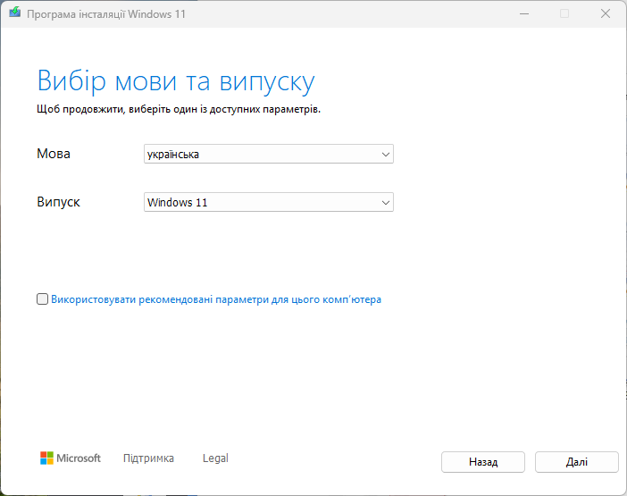 - На наступному екрані вам буде запропоновано налаштувати мову та випуск системи. За замовчуванням вибрано параметри, які відповідають вже встановленій на комп'ютері системі. Якщо зняти позначку «Використовувати рекомендовані параметри для цього комп'ютера», ви можете вибрати мову системи. Значення в полі Випуск залишиться Windows 11 - флешка міститиме Windows 11 64-bit Pro і Home.