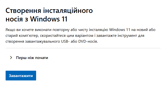 - У розділі «Створення інсталяційного носія Windows 11» натисніть кнопку «Завантажити» та збережіть утиліту Media Creation Tool до себе на комп'ютер.