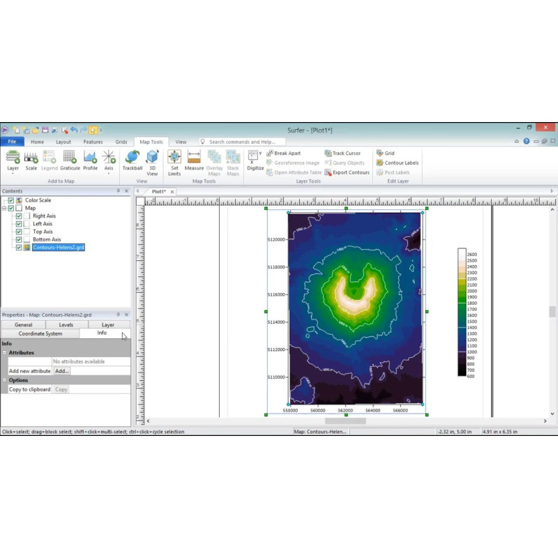 Golden Software Surfer відрізняє багате розмаїття створюваних карт: ізоліній, векторів, вихідних даних, затіненого рельєфу та інших. Різні карти можуть накладатися одна на одну визначення залежностей даних.
