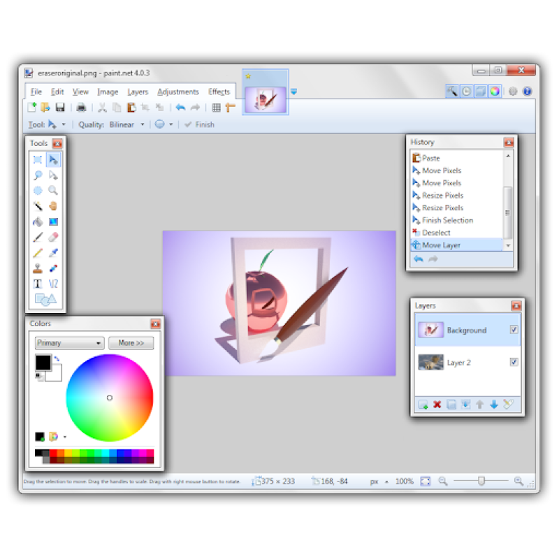 З Paint.NET можна без зайвих зусиль позбутися непотрібних об'єктів на фото, видаливши ненужні елементи; збільшити яскравість або змінити кольоровий баланс зображення; додати тінь, обрамлення, текст або підпис; застосувати високоякісні ефекти та багато іншого.
